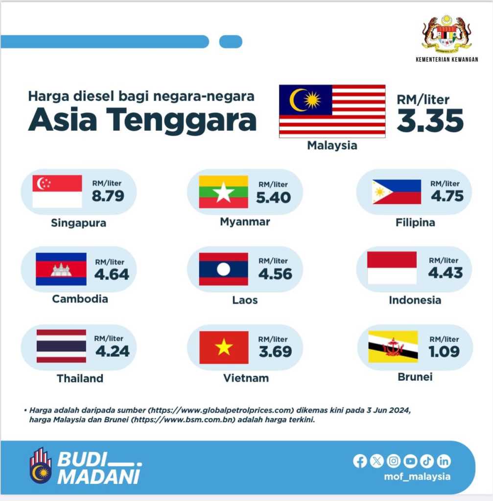 The first stage starts today with the flotation of diesel fuel in Peninsular Malaysia, where the RM3.35/litre price is based on the Automatic Pricing Mechanism formula for the month of May. This is a 55.8% increase, and despite that, diesel prices in Malaysia is still the second-cheapest in Southeast Asia. The flotation of diesel fuel will be implemented in Sabah, Sarawak, and Labuan at a later date.