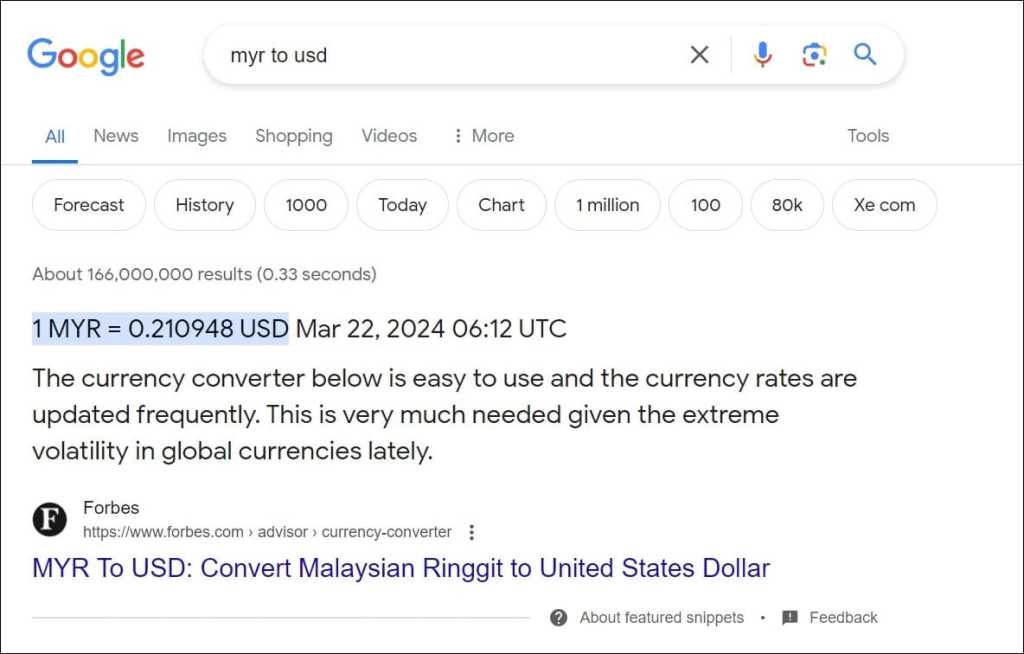 To explain, prior to this, Google’s widget would instantly show you the latest conversion rate when you search for currency conversions to and from the ringgit. It would also display a graph that charts the movement of the rate over a period of a time (over the course of one day, five days, a month, a year, five years, and so on).