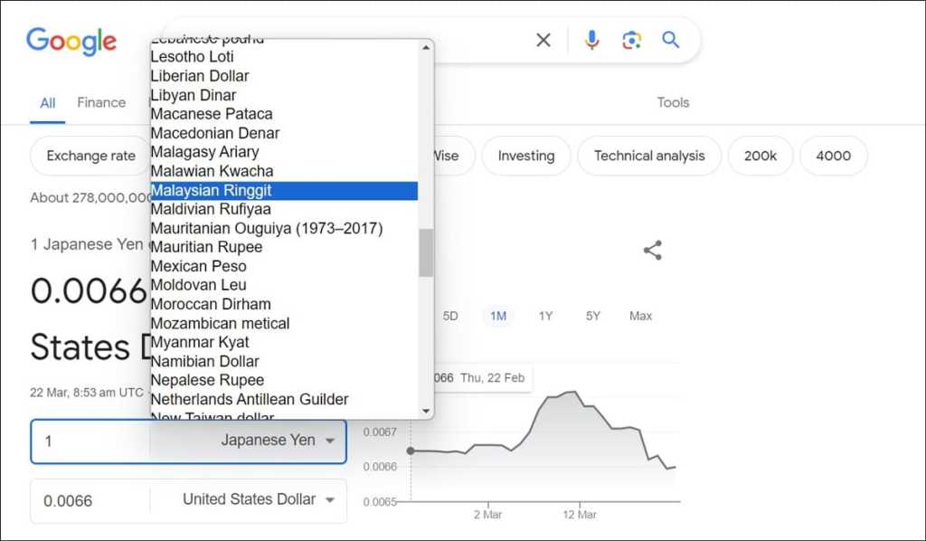 That’s not to say that there are no workarounds to this, if you absolutely must use Google’s currency conversion widget for your searches. However, it does require a few extra steps. Instead of making a straightforward search like “1 MYR to USD”, you’ll need to first search for other currency pairs, such as “JPY to USD”. From there, you can then select MYR (Malaysian Ringgit) from the dropdown menu that is available, and view the local currency conversion rate via Google’s widget.