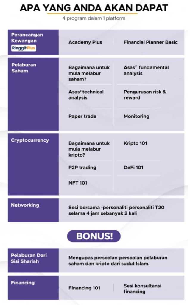 Its comprehensive modules engages participants to dive deep into financial and debt management as well as cash flow via the Financial Module taught by RinggitPlus, while the Stocks Module and Crypto Module will see participants understand the various ways to trade and earn passive income, and the Financing Module teaches participants how to raise capital through financing. Classes are conducted live in Bahasa Malaysia, and participants are encouraged to engage with the experts.