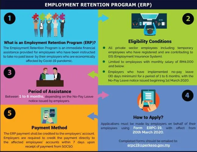 Under the Employment Retention Programme (ERP) by SOCSO, RM600 per month (up to a maximum of 6 months) will be provided to employees who have been issued with no-pay leave due to the Covid-19 pandemic. Only employees who are registered and contributing to the the Employment Insurance System (EIS) and receive a notice of no-pay leave of a minimum of 30 days are eligible. The assistance is only available to those earning RM4,000 and below a month.