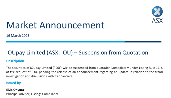 Just one day after officially dismissing its CFO on 13 March, IOUpay – which is listed on the Australian Securities Exchange (ASX) – then paused and halted the trading of its securities until 16 March due to a pending announcement to the market. Come 16 March, however, things were still unresolved. Instead, IOUpay’s securities were suspended from quotation immediately, “pending the release of an announcement regarding an update in relation to the fraud investigation and discussions with its financiers.”