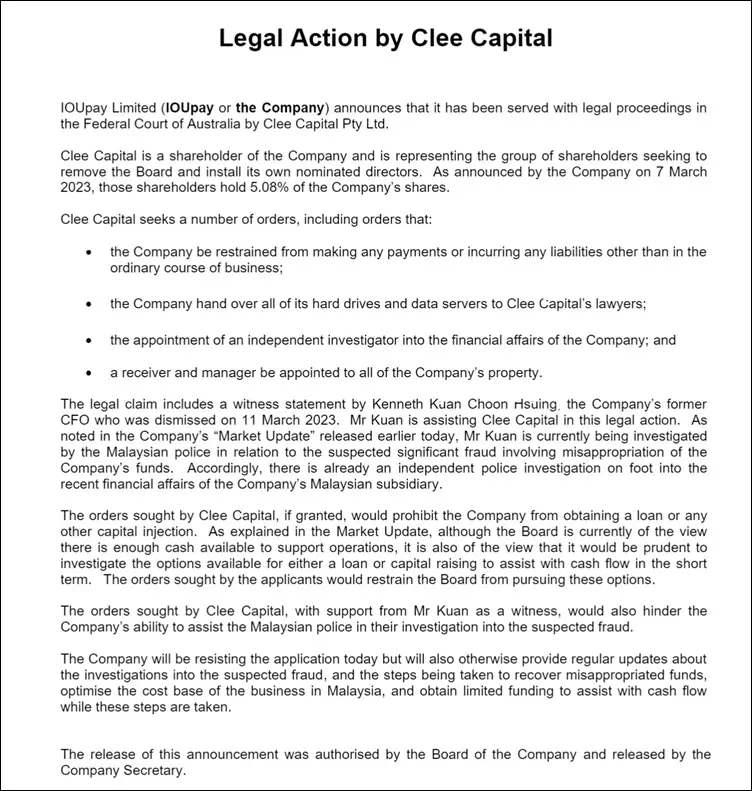 Fast forward to 22 March, IOUpay was dealt yet another blow. One of its shareholders, Clee Capital Pty Ltd had decided to initiate legal proceedings in the Federal Court of Australia against IOUpay. Notably, it is one of the shareholders who had earlier requested for the EGM to remove the current board of directors, aiming to appoint its own nominated directors instead.