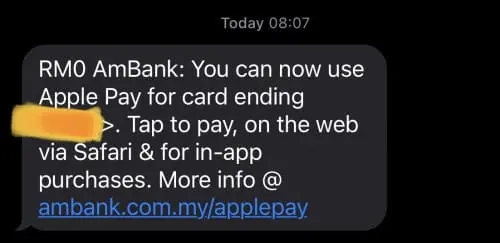 Local tech site Lowyat.NET reported that AmBank may be testing Apple Pay integration after an SMS was sent to one of its cardholders, clearly indicating Apple Pay pairing. The SMS even contained a URL for Apple Pay on AmBank’s website, but that page is not yet available. Both Apple and AmBank also did not respond to Lowyat.NET’s queries on the matter, as of the time of writing.