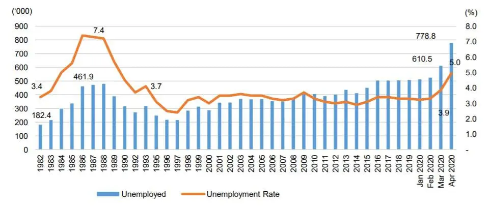 The unemployment rate in Malaysia for the month of April has spiked to 5%, the highest it has been in thirty years. The number of unemployed persons went up by 48.8% compared to the same time a year ago, with 778,800 people out of jobs in April 2020.