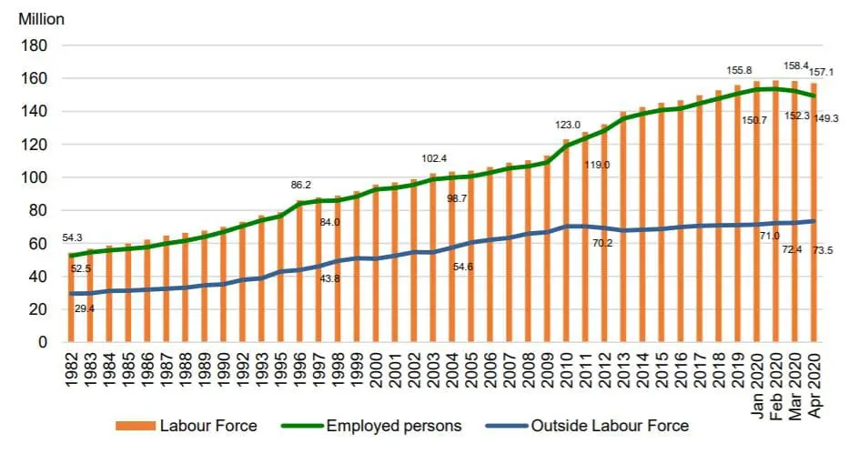The Department of Statistics Malaysia found that in April, the working population decreased by 156,400 persons or -1% year-on-year. Month-on-month, the working population decreased by 299,000 or -2% as compared to March 2020, which recorded 15.23 million persons working.
