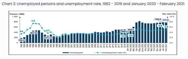 The unemployment rate in Malaysia has decreased slightly to 4.8% in February 2021 from 4.9% in January. According to the Department of Statistics Malaysia, the number of unemployed persons has reduced by 5,000 or 0.6% from 782,500 persons in January to 777,500 persons.