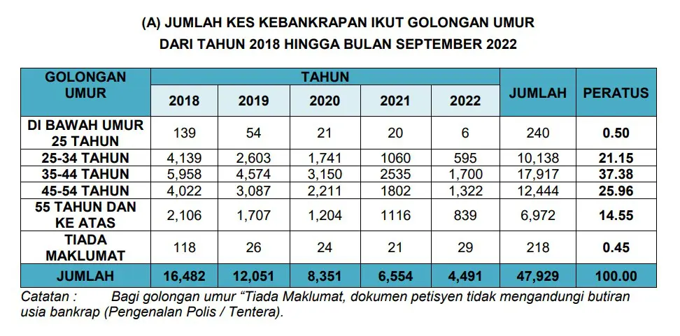 Based on MdI’s data, 58% of individuals who were declared bankrupt from 2018 to September 2022 belonged to the age group of 25 to 44 years old, equivalent to 28,055 persons (2,295 persons in 2022, as of September). Meanwhile, bankrupt individuals under the age of 25 years old that were recorded from 2018 to September 2022 came up to only 0.5%, with only 6 individuals this year.