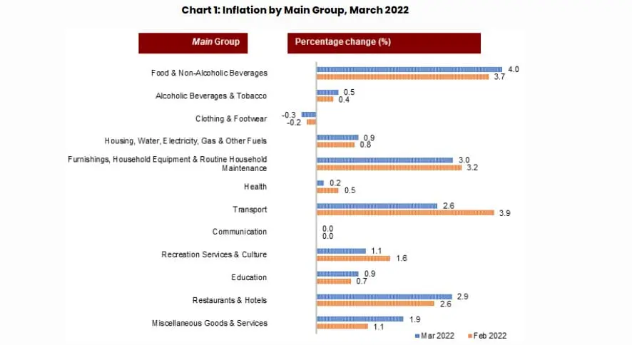 Core inflation, meanwhile, showed an increase of 2.0% in March 2022 as compared to the previous year, with the transport group registering the highest increase at 3.9%. Other groups which also recorded a rise included the food and non-alcoholic beverages (3.5%), furnishings, household equipment and routine household maintenance (3%), restaurants and hotels (2.9%), miscellaneous goods and services (1.9%), and recreation services and culture (1.1%).