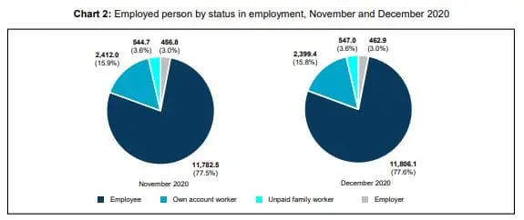 To further dissect the number of employed persons by category, those in the employee category have increased by 0.2% from the previous month to come up to 11.81 million persons in December. This made up 77.6% of overall employment in the country. Meanwhile, own-account workers (self-employed) fell by 0.6% to 2.4 million persons, decreasing for the third month in a row. This group accounted for another 15.8% of overall employment. The remaining 6.6% of the overall employment consisted of unpaid family worker (3.6%) and employers (3%).