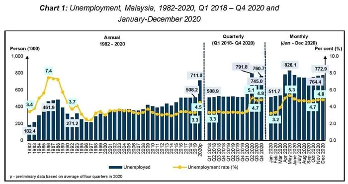 The unemployment rate in Malaysia for December 2020 has remained unchanged at 4.8% since November 2020, according to the latest data from the Department of Statistics Malaysia (DOSM). Meanwhile, the number of unemployed persons increased by 1.1% since the previous month to settle at a total of 772,900 people in December.