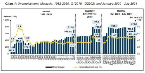 The latest labour report from the Department of Statistics Malaysia (DOSM) indicated that Malaysia’s unemployment rate for July 2021 has remained unchanged from the previous month, set at 4.8%. However, the number of unemployed individuals increased slightly by 1.2% to record a total of 778,200 persons compared with 768,700 persons in June 2021.