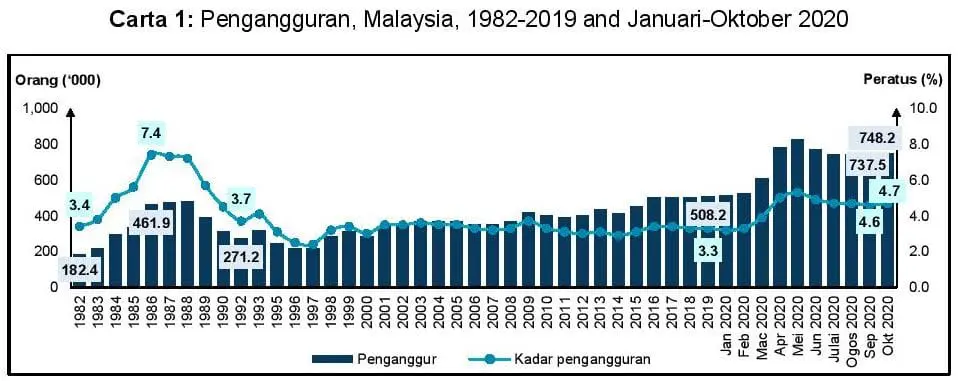 The unemployment rate in Malaysia has increased by 0.1% since September to stand at 4.7% in October, said the Department of Statistics Malaysia (DOSM) in its latest monthly labour force report. It also noted that the number of unemployed individuals rose by 1.5% (10,700 people) to total up to 748,000 people.