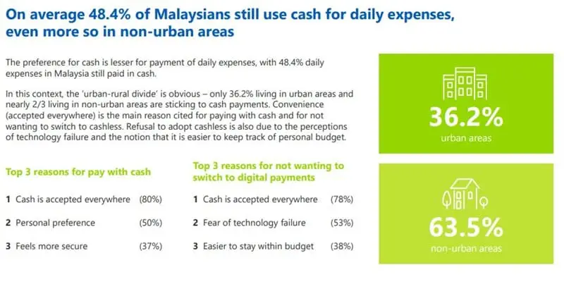 In its study, PayNet revealed that while cash still reigns as the preferred payment method among Malaysians, the overall reliance on cash has dropped – a trend that is also observed in other countries. The study also found that fewer Malaysians used cash when it came to daily payments (48.4%). Area-wise, those in rural areas appeared to have a higher preference for cash payment (63.5%) than those in urban areas (36.2%).