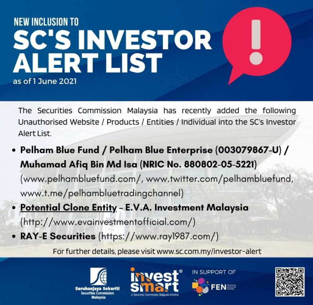 The Securities Commission has updated its Investor Alert List to include six new entries, with the most prominent among them being the Pelham Blue Fund, a popular investment discussion group which provides regular updates on local stock market movements via its Telegram and Twitter accounts.