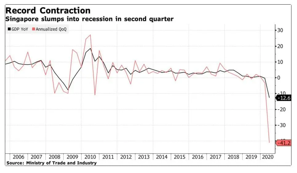 The Singaporean economy plunged into a recession in the second quarter of 2020, with a decline of 41.2% in gross domestic product (GDP) from the previous three months. The drop in GDP is the nation’s biggest quarterly contraction on record.