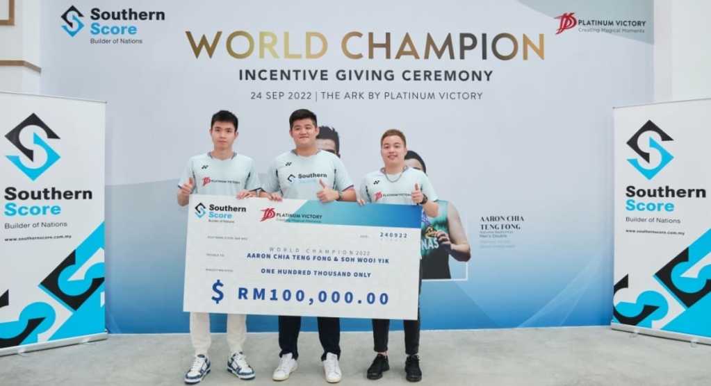 Construction management services company Southern Score Sdn Bhd has rewarded top shuttlers, Aaron Chia and Soh Wooi Yik with an incentive of RM100,000 for winning Malaysia’s first gold at the World Badminton Championships in Tokyo last month.