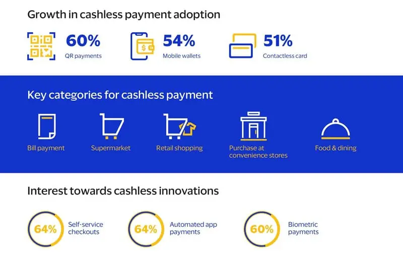 Moreover, consumers are showing increasing preference to shop with merchants that accept cashless payment options instead of cash-only options. There is also a growing interest in other cashless innovations, including self-service checkouts (64%), automated app payments (64%), and biometric payments (60%).