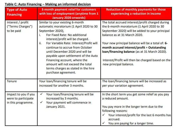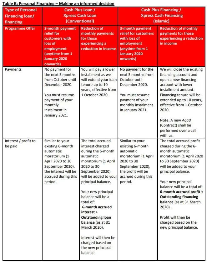In the screenshot above, the arrangement for personal financing – both conventional (Cash Plus Loan / Xpress Cash Loan) and Islamic (Cash Plus Financing / Xpress Cash Financing) reveals that interest accrued during the 6-month automatic moratorium (1 April – 30 September) will be added into the principal balance as part of the targeted financial assistance programme. It is essentially a restructuring & rescheduling (R&R) exercise on the existing loan/financing – but the principal balance now includes the accrued interest from April till September. This means the interest accrued from 1 April till 30 September will now compound from October onwards.