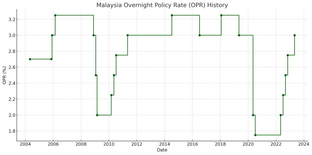In early 2009, during the global financial crisis, the OPR was cut from 3.25% to 2.00% in a short span to counter the effects of falling exports and tightening credit conditions.