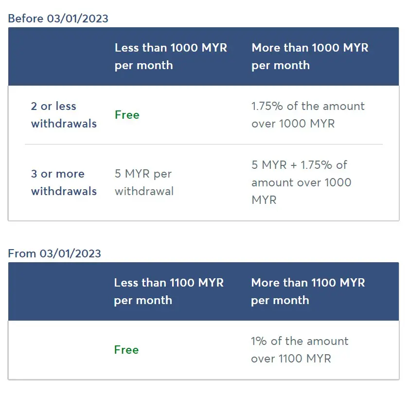 Come 3 January 2022, the current fee structure will be simplified for the convenience of users. “Now, you can withdraw up to RM1,100 cash per month for free, and we’ll simply charge 1% of the amount for additional withdrawals above this limit. This applies for ATM withdrawals, as well as withdrawing cash from a merchant or bank, money orders, foreign exchange, or bureau de change,” said Wise in a notice sent to its users.