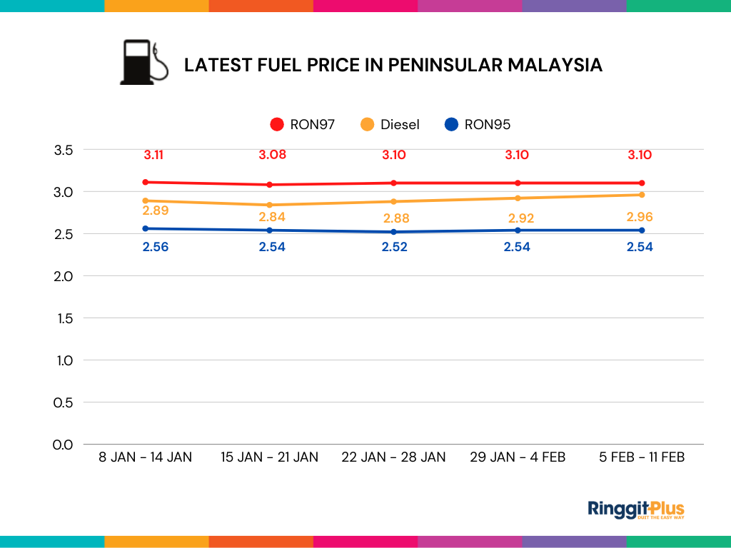 | February 5, 2025- February 11, 2025 | BUDI95: RM1.99 (RM0) RETAIL: RM2.54 (RM0) | RM3.10 (RM0) | PM: RM2.96 (+RM0.04) EM: RM2.15 (RM0) |
