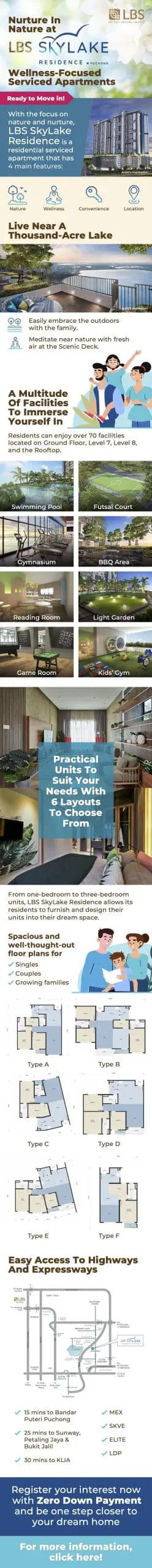 Imagine taking a swim, a walk, and relaxing right at home. With close-by amenities, over 70 facilities, spacious layouts, and a 1,000-acre lake just outside your doorstep, ready-to-move-in units at LBS SkyLake Residence could be the home that’s right for you, your loved ones, and your well-being. Check out the units online on their website, and register your interest today!