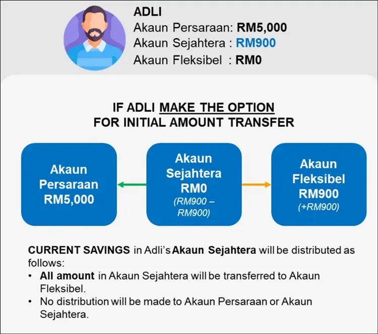 If you choose to opt in for this initial amount transfer, some of your Akaun Sejahtera funds will be reallocated into Akaun Fleksibel (and Akaun Persaraan) based on the following conditions and arrangements: