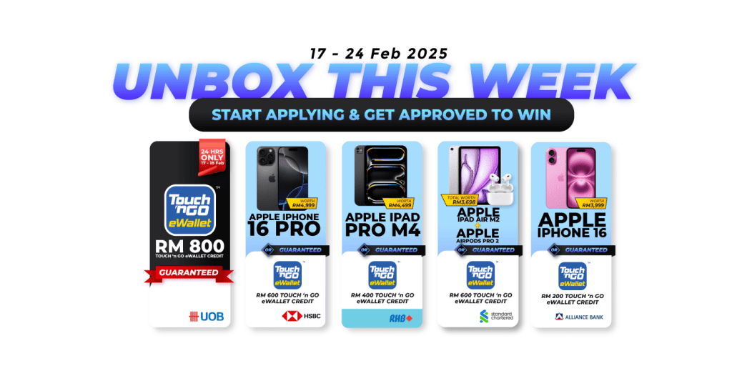 It’s time to win, win, win some amazing Apple products! Apply now and you could be walking away with the iPhone 16 Pro, BOTH the iPad Air 11-inch (M2) and the AirPods Pro 2, or even RM800 Touch ‘n Go eWallet Credits guaranteed, and more when you apply for a credit card via RinggitPlus.