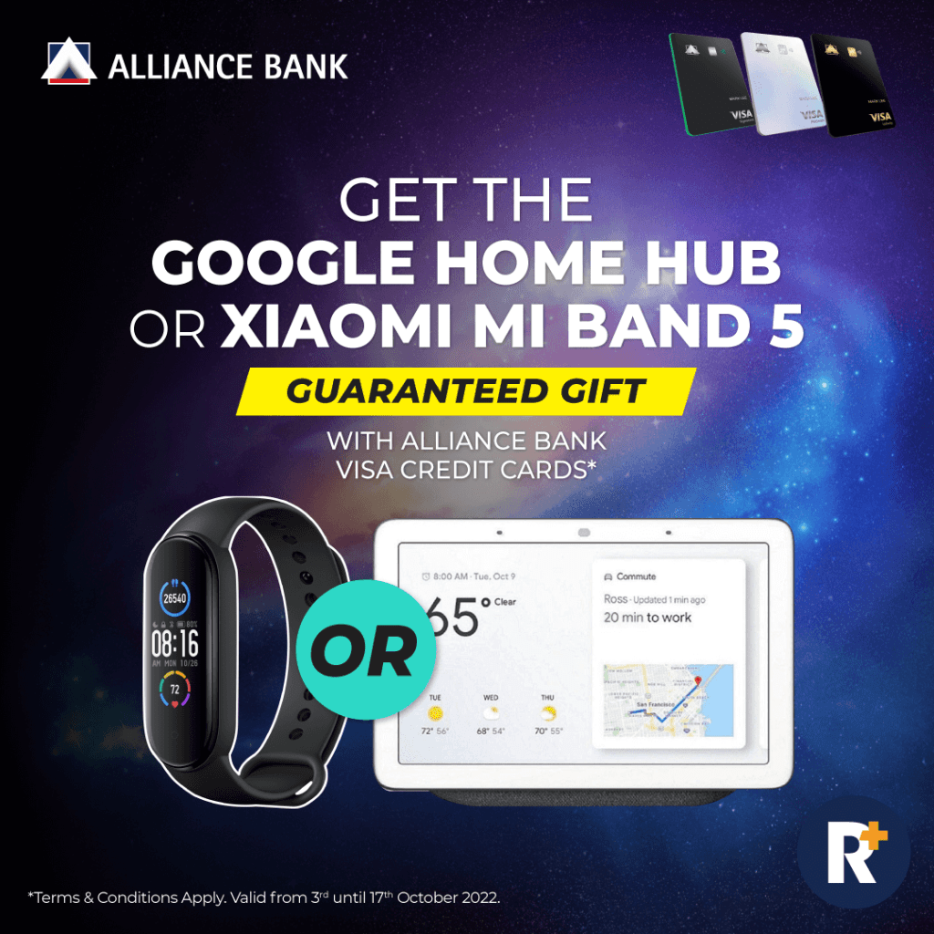 Meanwhile, you’re guaranteed the Xiaomi Mi Band 5 when you apply for an Alliance Bank Credit Card. Have a trusted fitness band that can measure your activity levels with 11 professional sports modes, a long-lasting 14-day battery life, as well as 24-hour heart rate and sleep monitoring with women’s health tracking.