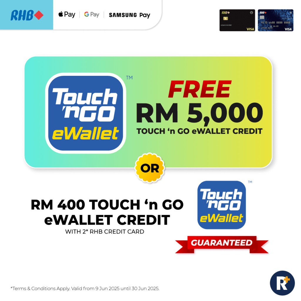 Our biggest cash prize this week! Stand a chance to win RM5,000 Touch ‘n Go eWallet Credits when you apply for a RHB Credit Card.