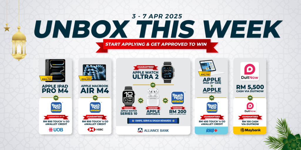 Selamat Hari Raya from all of us at RinggitPlus! The festive season is a time for gifting and we’ll be giving away some amazing prizes on Unbox This Week. Apply now and you could be walking away with a cash prize of up to RM5,500, Apple Products, or even RM600 Touch ‘n Go eWallet Credits guaranteed, when you apply for a credit card via RinggitPlus.