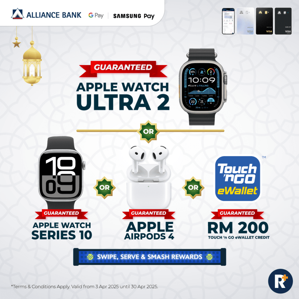 Apple Fans, rejoice! This week, apply for an Alliance Bank Credit Card and you could be walking away with guaranteed Apple Watch Ultra 2, Apple Watch Series 10, AirPods 4, OR even RM200 Touch ‘n Go eWallet Credits.