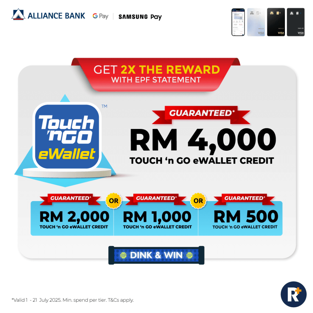 This week, apply for an Alliance Bank Credit Card with your EPF Statement and you are guaranteed to walk away with RM4,000, RM2,000, RM1,000, or RM500 in Touch ‘n Go eWallet Credits!