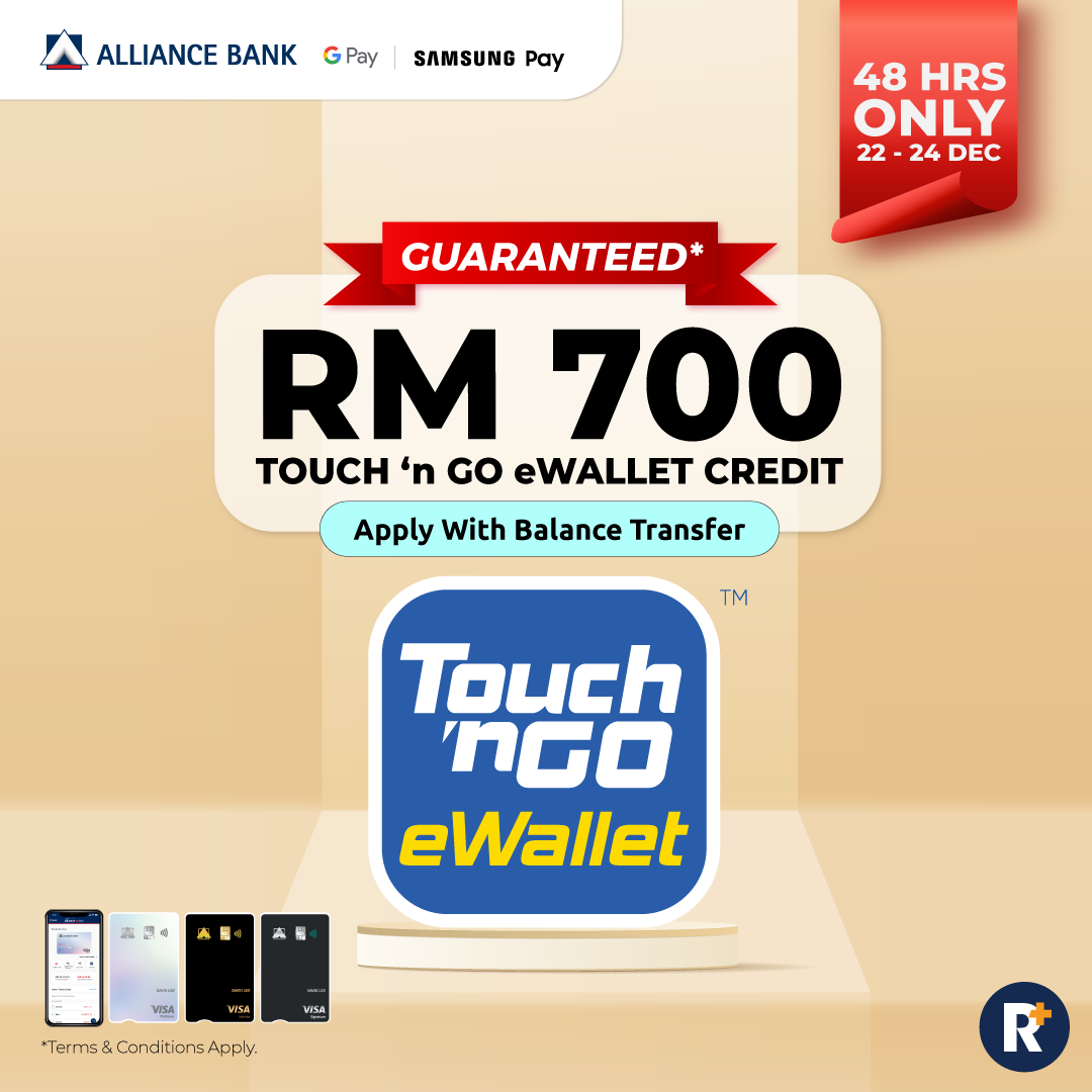 For 48 hours only, Alliance Bank is offering RM700 Touch ‘n Go eWallet Credit guaranteed when you apply with Balance Transfer.