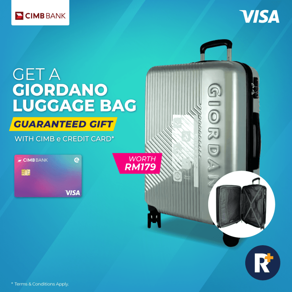 CIMB is giving away a guaranteed Giordano Luggage Bag to all its successful credit card applicants. It’s easy to win this handy luggage bag that will get you ready for your next trip. Just apply, activate, and perform the first swipe of any amount to be eligible for this gift!