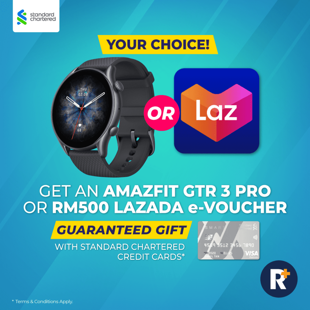 Standard Chartered is now giving ALL approved applicants a choice of the new Amazfit GTR 3 Pro or RM500 Lazada e-Voucher as their gift! Stylish yet functional, the Amazfit GTR 3 Pro comes with Ultra-HD AMOLED Display, 150 plus sport modes, and is compatible with Alexa virtual assistance.