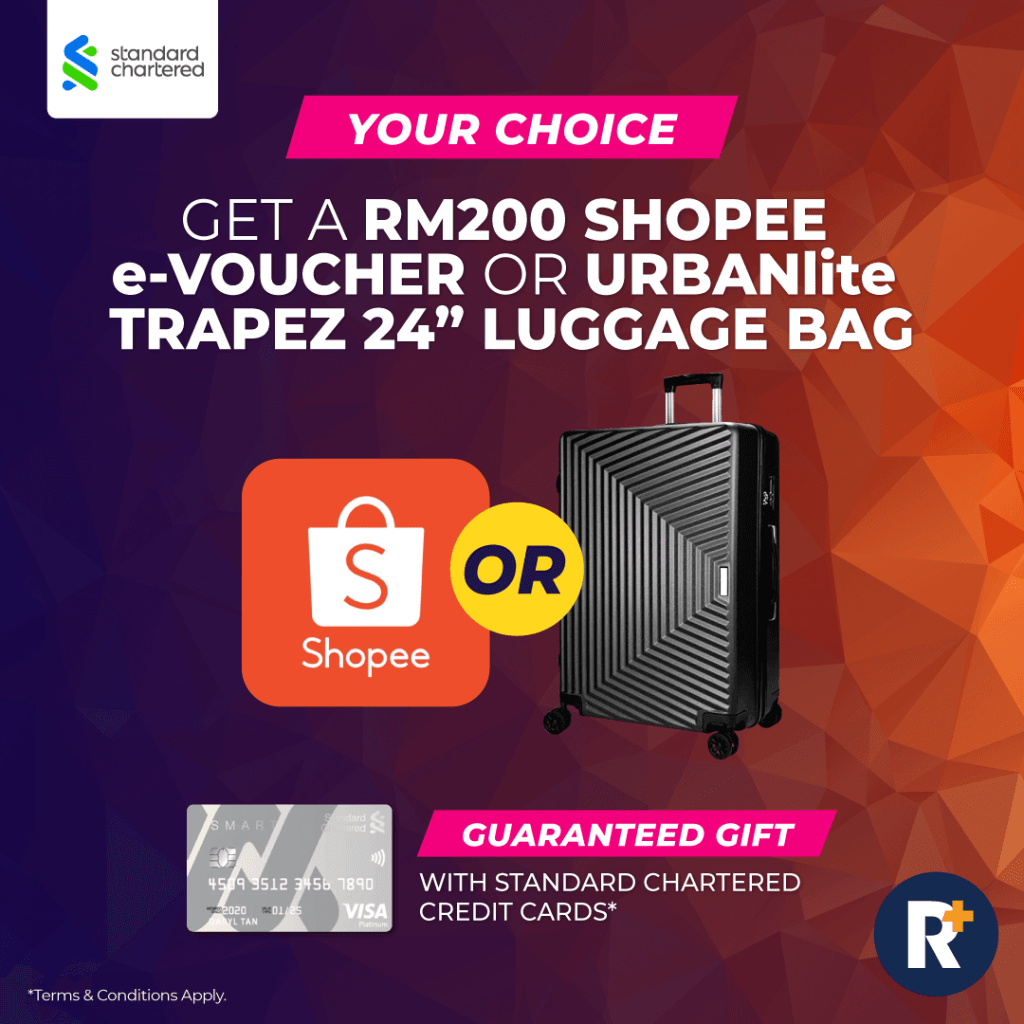 Claim your guaranteed gift from Standard Chartered! Choose between a RM200 Shopee e-Voucher for your online purchases or an URBANlite 8-Wheel Spinner Hard Case Luggage to ease your packing situation for your next trip.