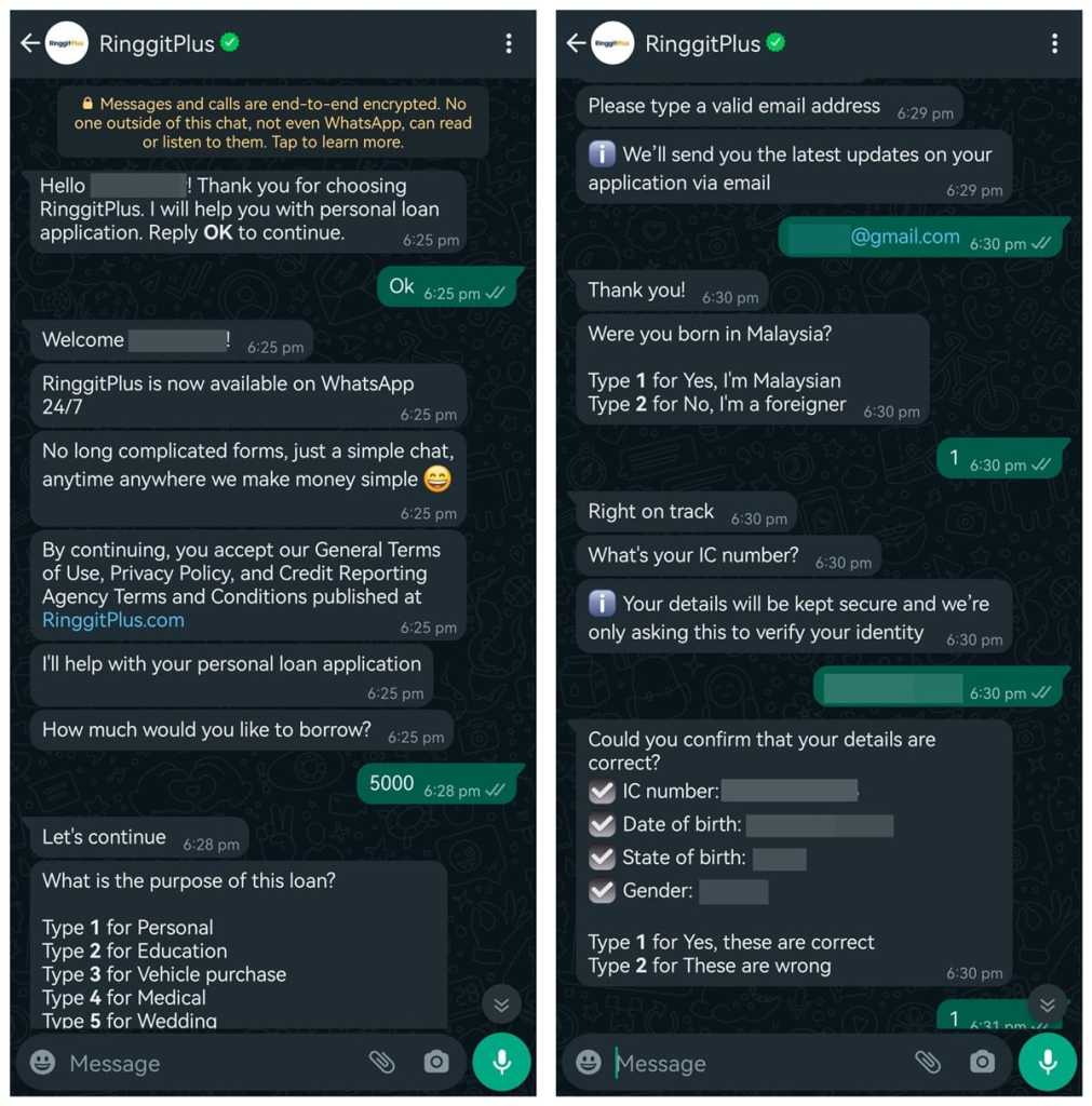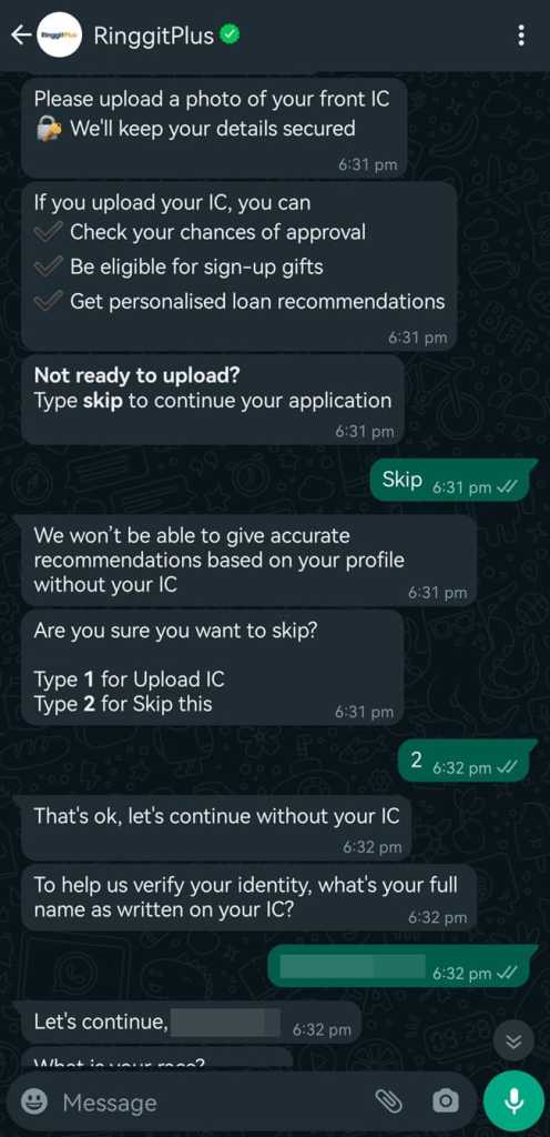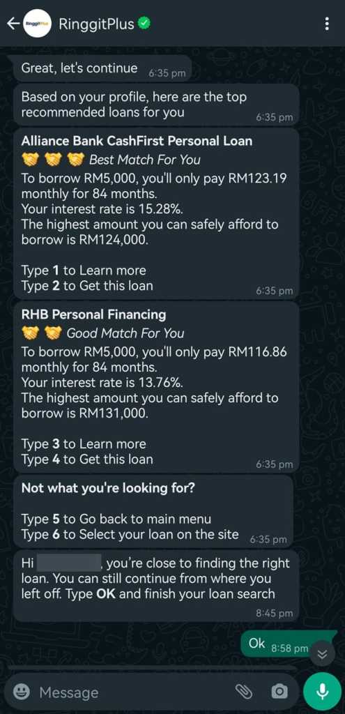 More importantly, our WhatsApp chatbot is also enhanced with our proprietary recommendation tool built into the chatbot, where you’ll be presented with a list of personal loan/financing products that you’re most likely to be approved based on your current financial situation – a unique proposition only provided by RinggitPlus. In some cases, you may even receive instant conditional approval on your loan application! With such advantages, it means that you can avoid situations where you’d make the effort to apply to different banks, only to hear back several weeks later that your applications have, unfortunately, been rejected.