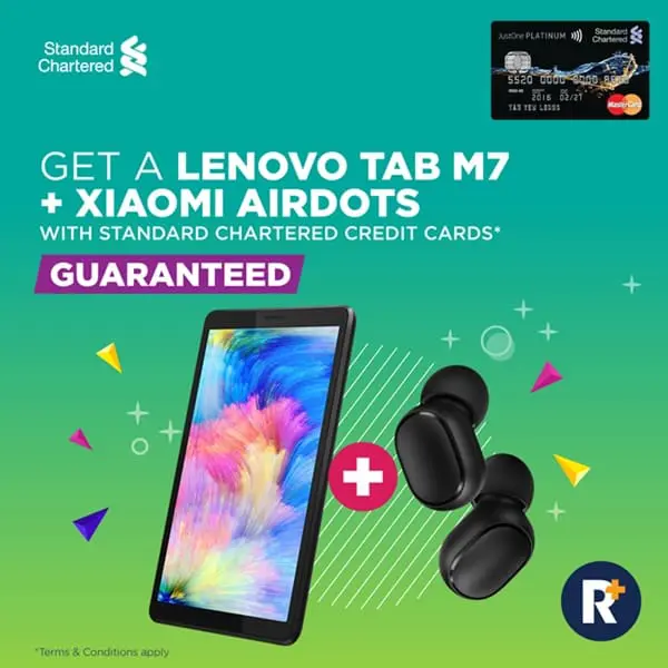 Apply for specific cards from Standard Chartered with us, and you are guaranteed to win a Lenovo Tab M7 and a pair of Xiaomi AirDots – a bundle that’s worth RM548. Once your application has been approved, be sure to activate your card within 30 days to be eligible for the gifts. To claim your gifts, you’ll need a redemption code which we will send to you within 28 days once the bank has confirmed your eligibility.