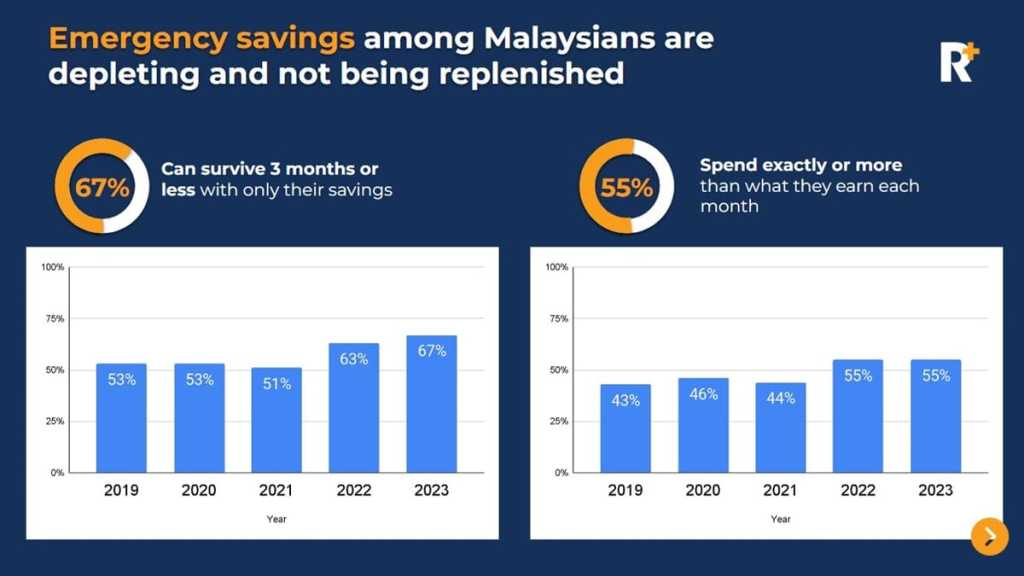 It is not hard to see why. This year, 71% of respondents could only save less than RM500 each month, while 67% state that their emergency savings can last them for three months or less. Meanwhile, 55% of respondents admit to spending equal or more than what they earn each month, essentially living paycheck to paycheck.