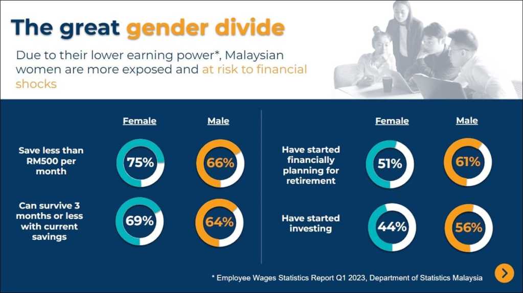 The RMFLS 2023 survey also highlights the financial vulnerabilities faced by Malaysian women. Due to a combination of low work force participation and a growing wage disparity, Malaysian women are more exposed to financial shocks.