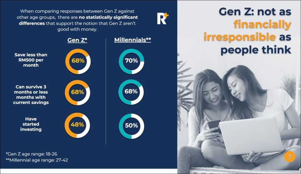 In fact, when compared to the national average and other generations, there are no statistically significant differences that convey a lack of financial responsibility and literacy among Gen-Z respondents. For example, 68% of Gen-Zs save less than RM500 a month, compared to the 71% national average or 70% of Millennials.