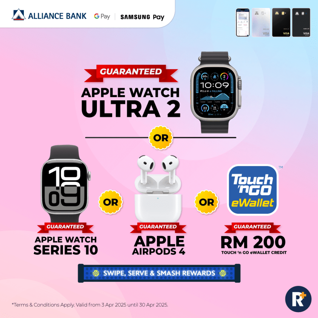 Apple Fans, rejoice! This week, apply for an Alliance Bank Credit Card and you could be walking away with guaranteed Apple Watch Ultra 2, Apple Watch Series 10, AirPods 4, OR even RM200 Touch ‘n Go eWallet Credits.