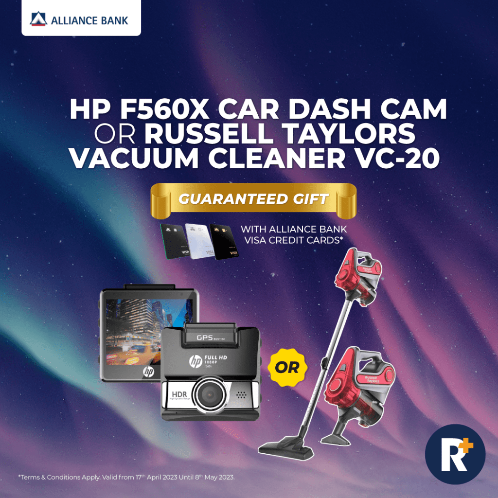 The HP f560x Car Dash Cam or Russell Taylors VC-20 Vacuum is yours to keep when you apply for a new Alliance Bank Credit Card.