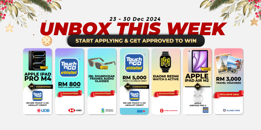 Christmas is finally here on RinggitPlus! Unbox this week is back again with some of the most anticipated prizes ever given away! Win the iPad Pro M4, RM5,000 Touch ‘n Go eWallet Credits or even walk away with RM3,000 Travel Vouchers and more when you apply for a credit card via RinggitPlus.