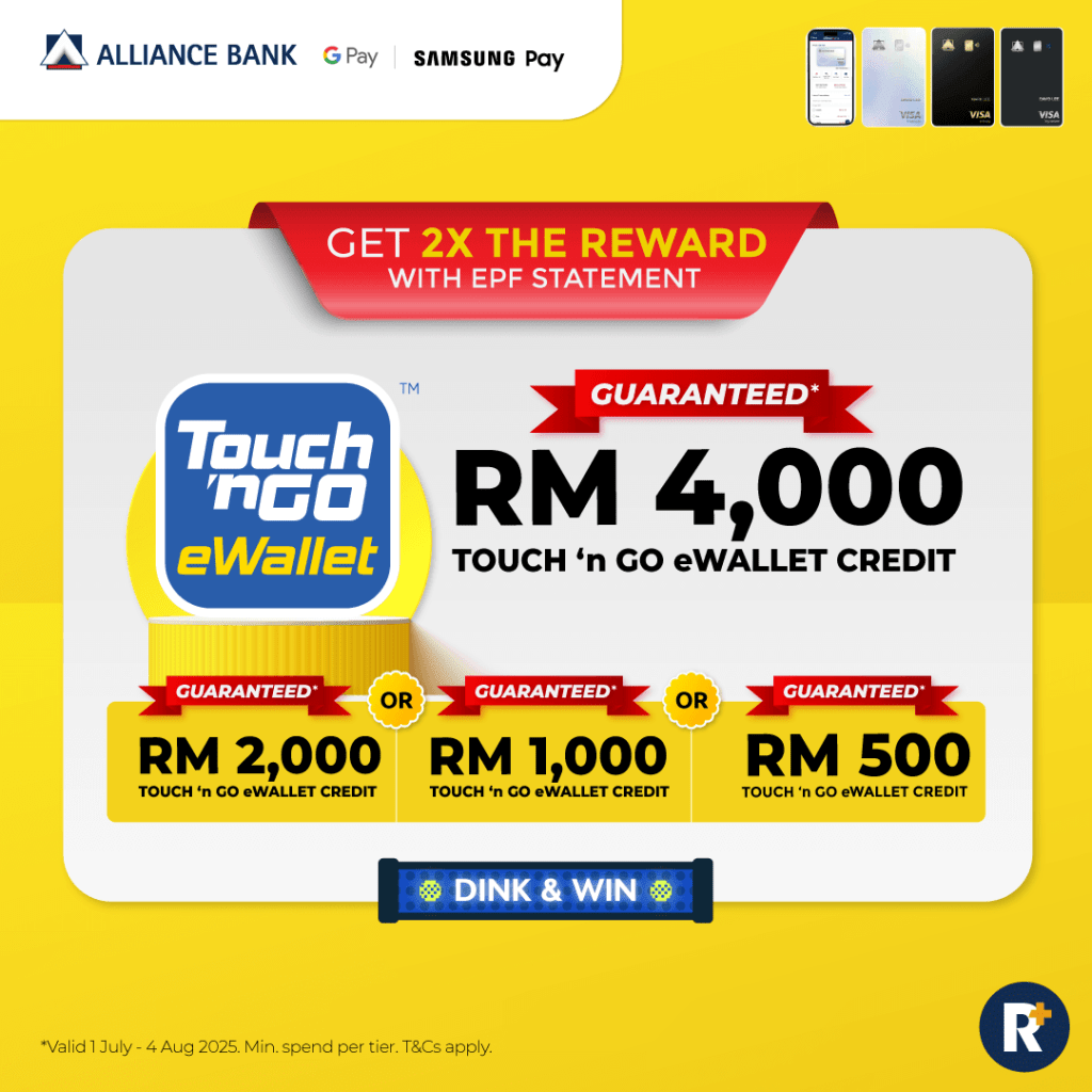 This week, apply for an Alliance Bank Credit Card and you are guaranteed to walk away with RM4,000, RM2,000, RM1,000, or RM500 in Touch ‘n Go eWallet Credits!