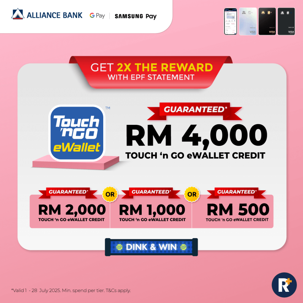 This week, apply for an Alliance Bank Credit Card and you are guaranteed to walk away with RM4,000, RM2,000, RM1,000, or RM500 in Touch ‘n Go eWallet Credits!
