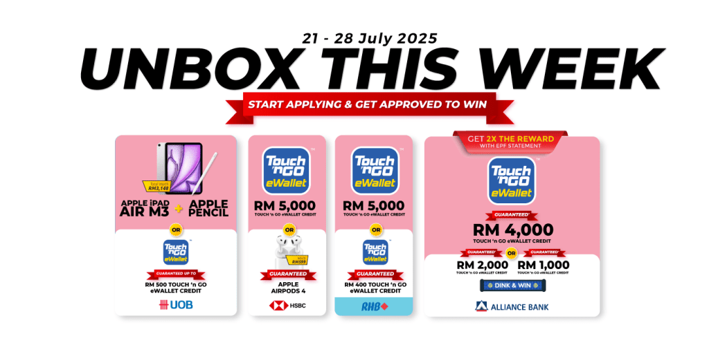 We’re back with another round of amazing gifts to take home on Unbox This Week! Apply for a credit card through RinggitPlus and you could be walking away with BOTH the iPad Air M3 and Apple Pencil, or even secure up to RM4,000 Touch ‘n Go eWallet Credits guaranteed.