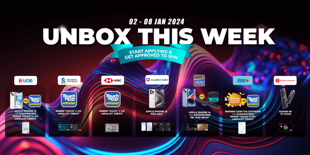 Happy New Year to all our readers on RinggitPlus! If your New Year’s resolutions include applying for a credit card in 2024, why not check it off your list and win great prizes along the way? Stand a chance to win amazing gifts, such as RM5000 in cash via DuitNow, the new iPhone 15, iPhone 15 Pro, or even walk away with a guaranteed RM800 in Touch ‘n Go eWallet Credit on Unbox This Week.